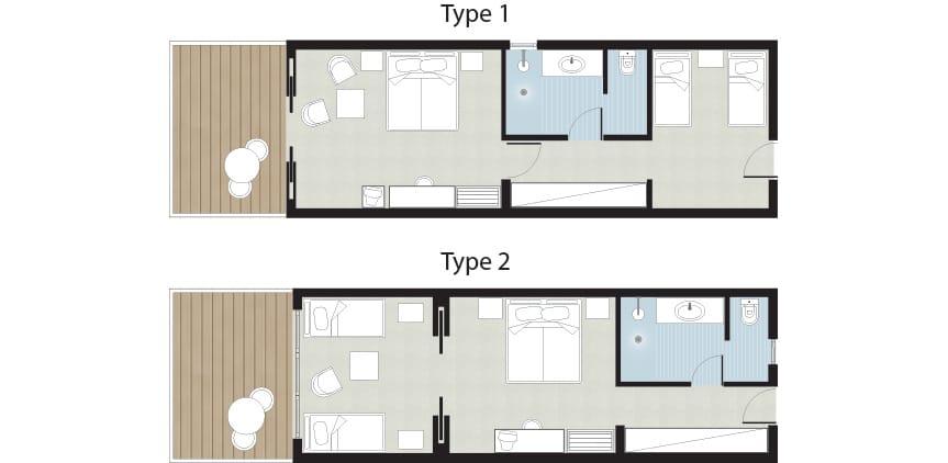 In cool crisp colors echoing the vibrant gardens, these spacious family bungalows conveniently offer two sleeping areas, making it an ideal space for younger guests and their parents.