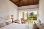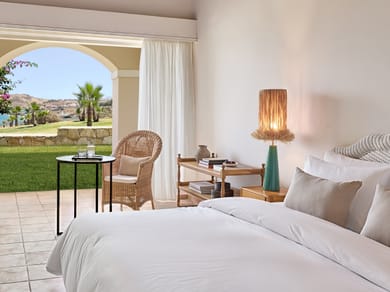 Candy colored bungalows with bamboo furniture in a tasteful modern style, surrounded by lush Cretan gardens that blend harmoniously with the village-like hotel environment.