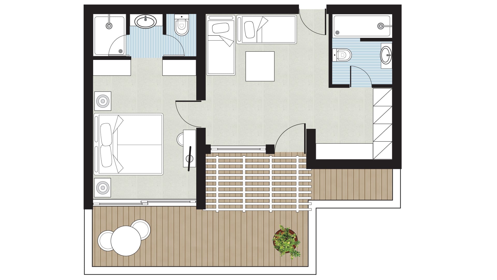 - SIZE: Spacious 45-50m² suite with two separate sleeping areas